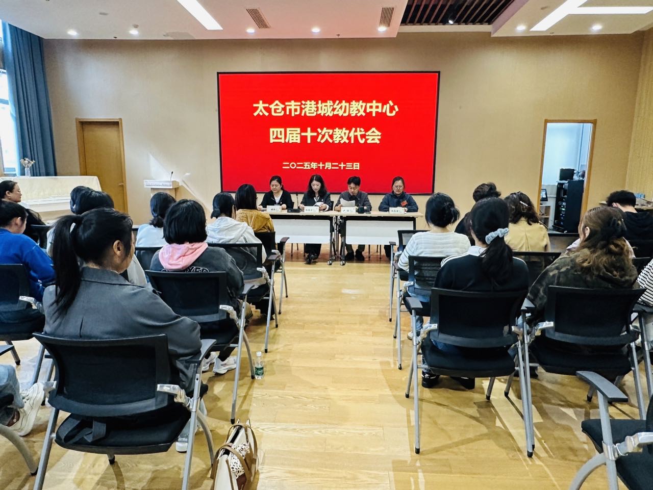2025年10月23日中午,太仓市港城幼教中心第四届教职工代表大会第十次会议在庄严的国歌声中拉开帷幕。来自中心各园的43名正式代表齐聚一堂,为完善教师权益保障机制、推动园所高质量发展凝聚共识。